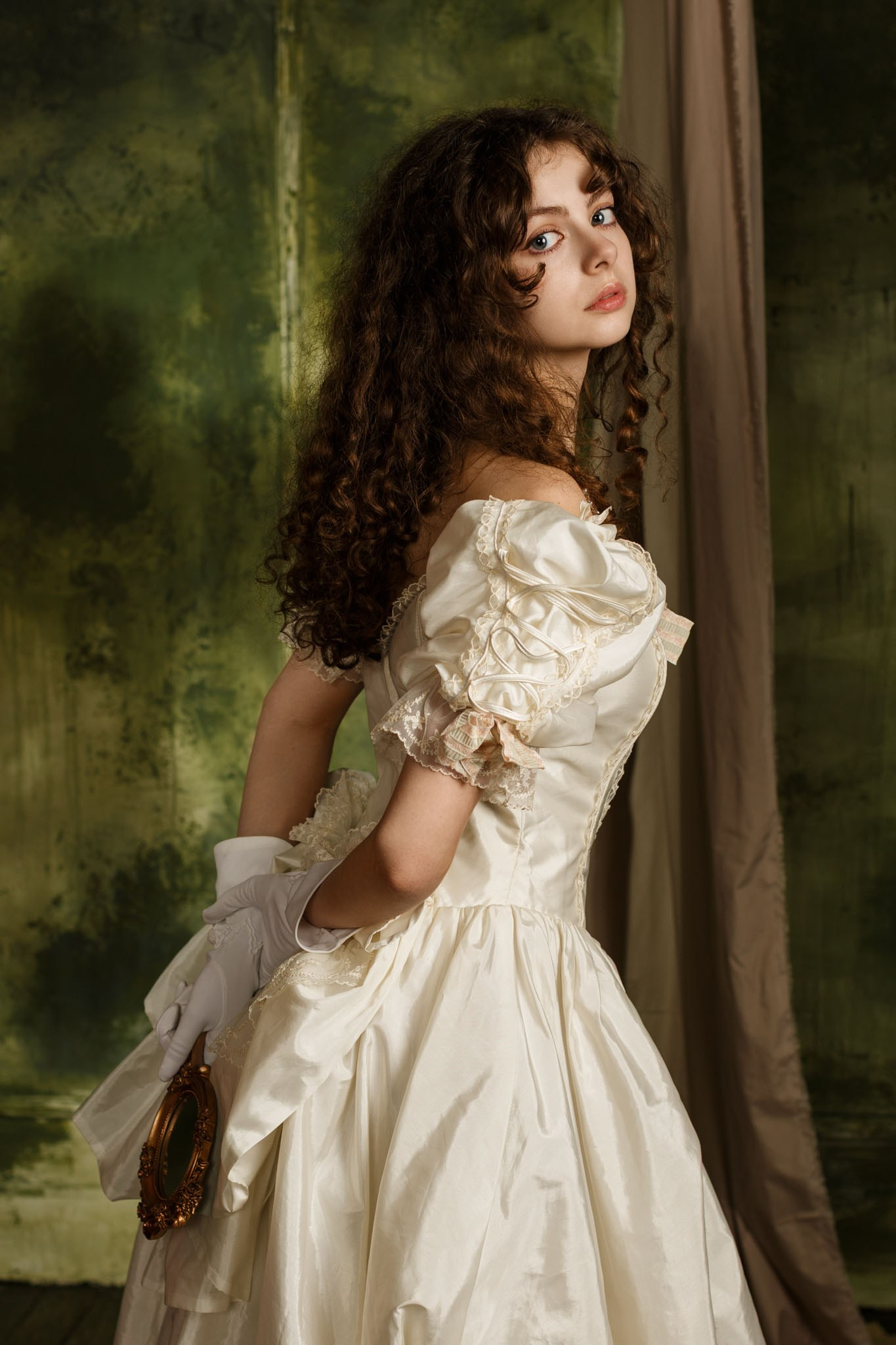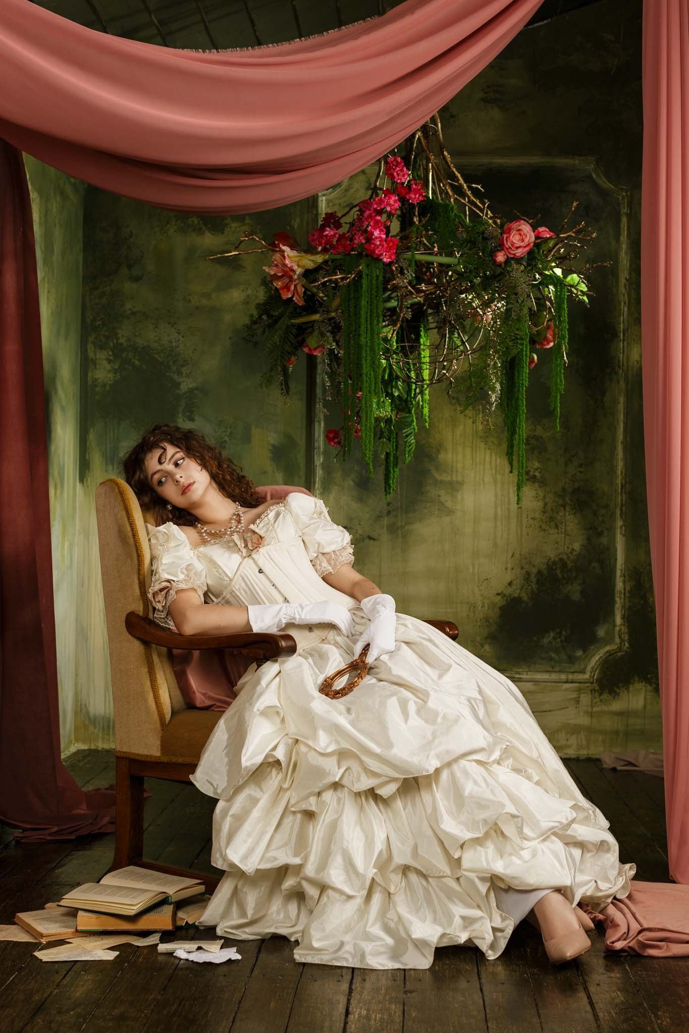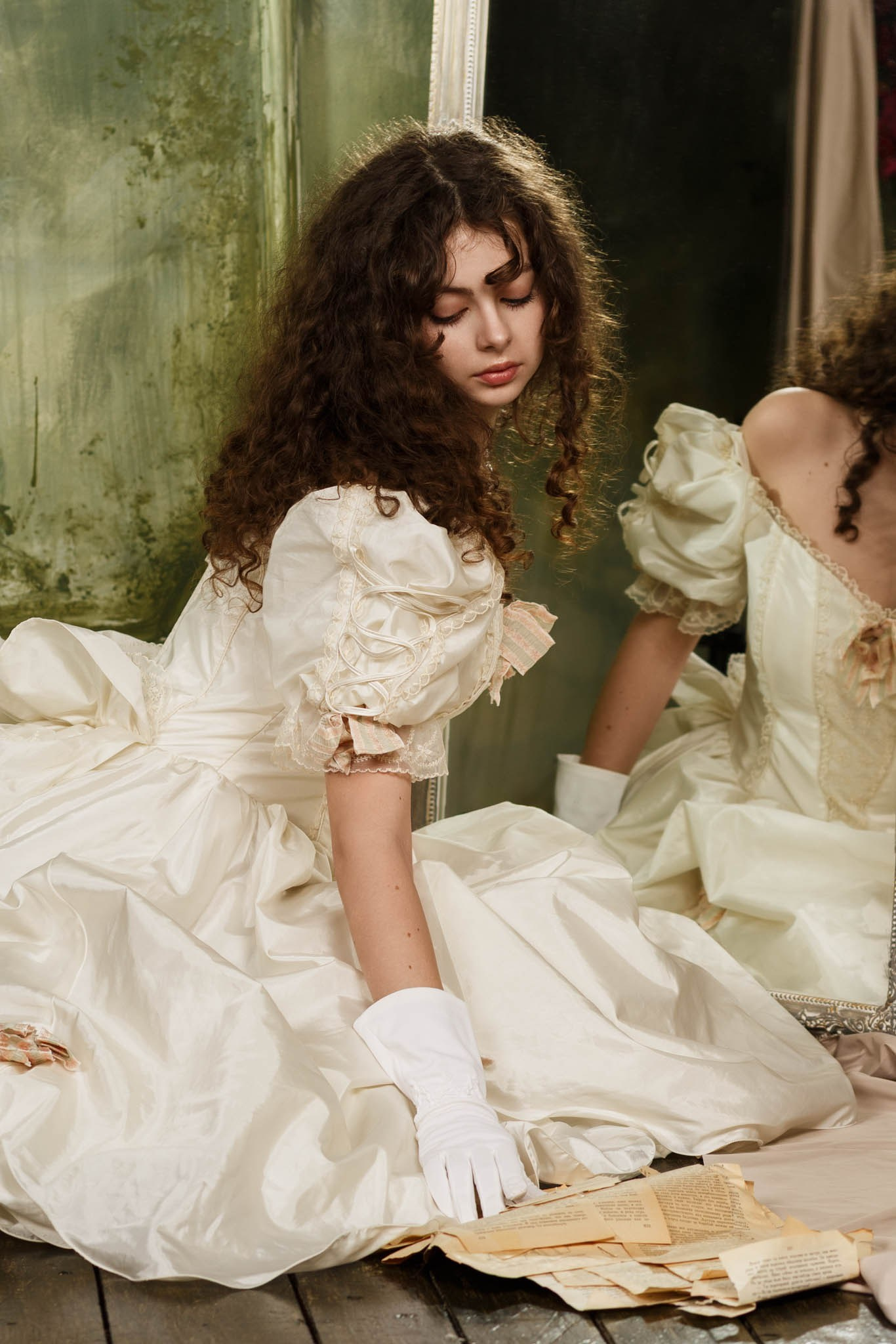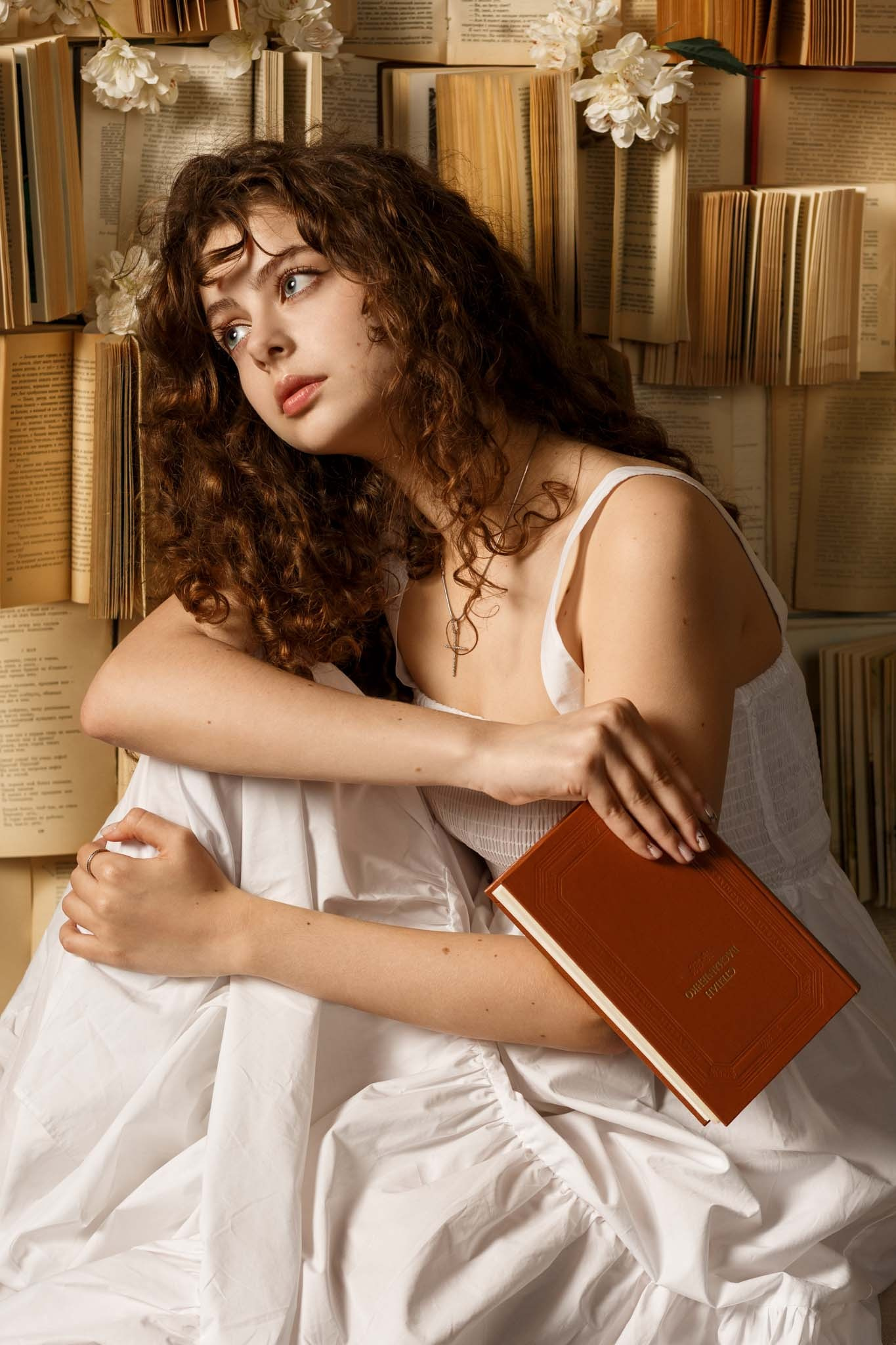 Ми вирішили створити твочу фотосесію про дівчину, яка любить читати класичні романи. За сюжетом, читаючи роман, вона поринає в свої мрії, тобто книжка слугувала порталом між реальністю та уявним світом. Для створення цього образу ми обрали фотостудію Ochi Project і сукню від Vintage Chic