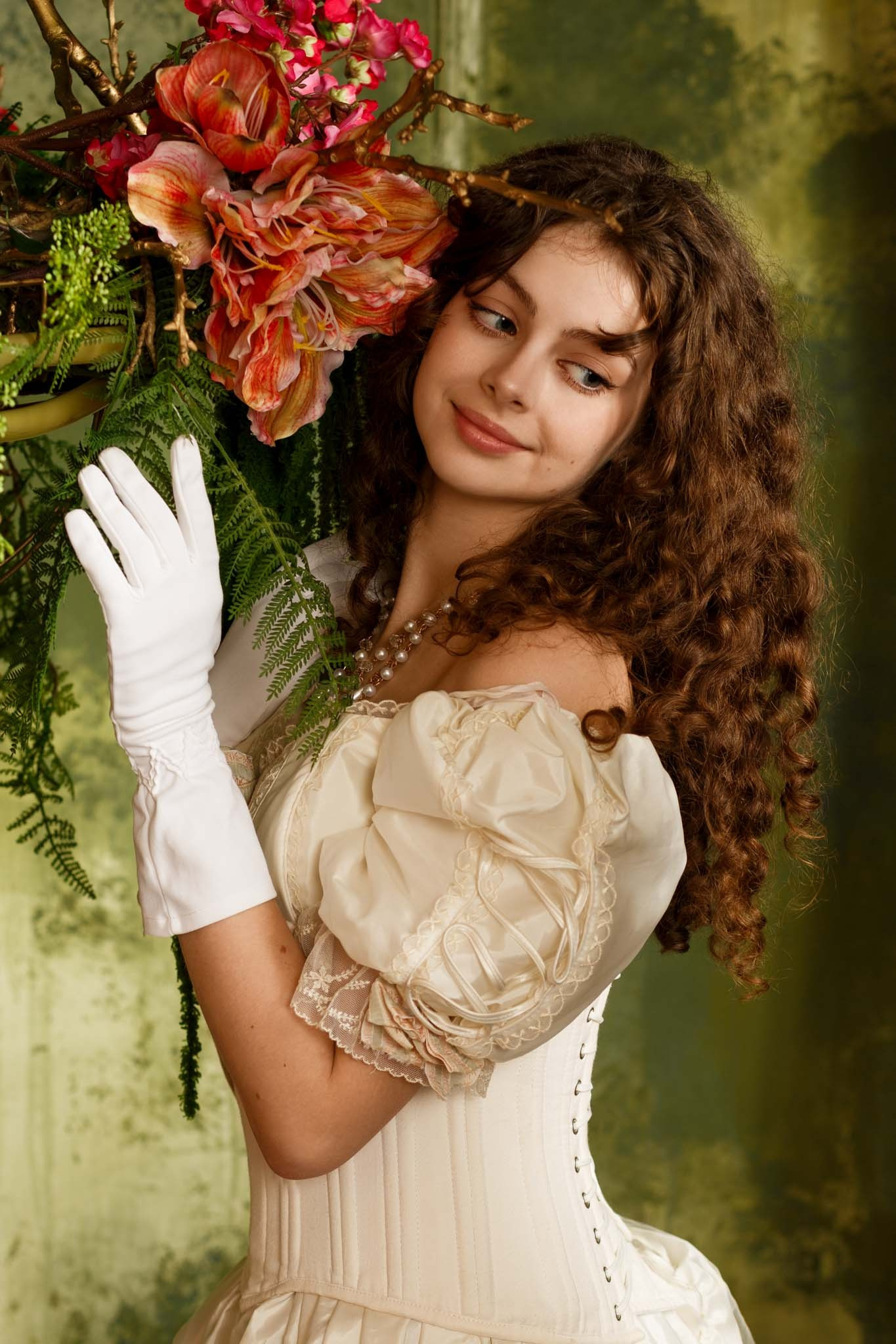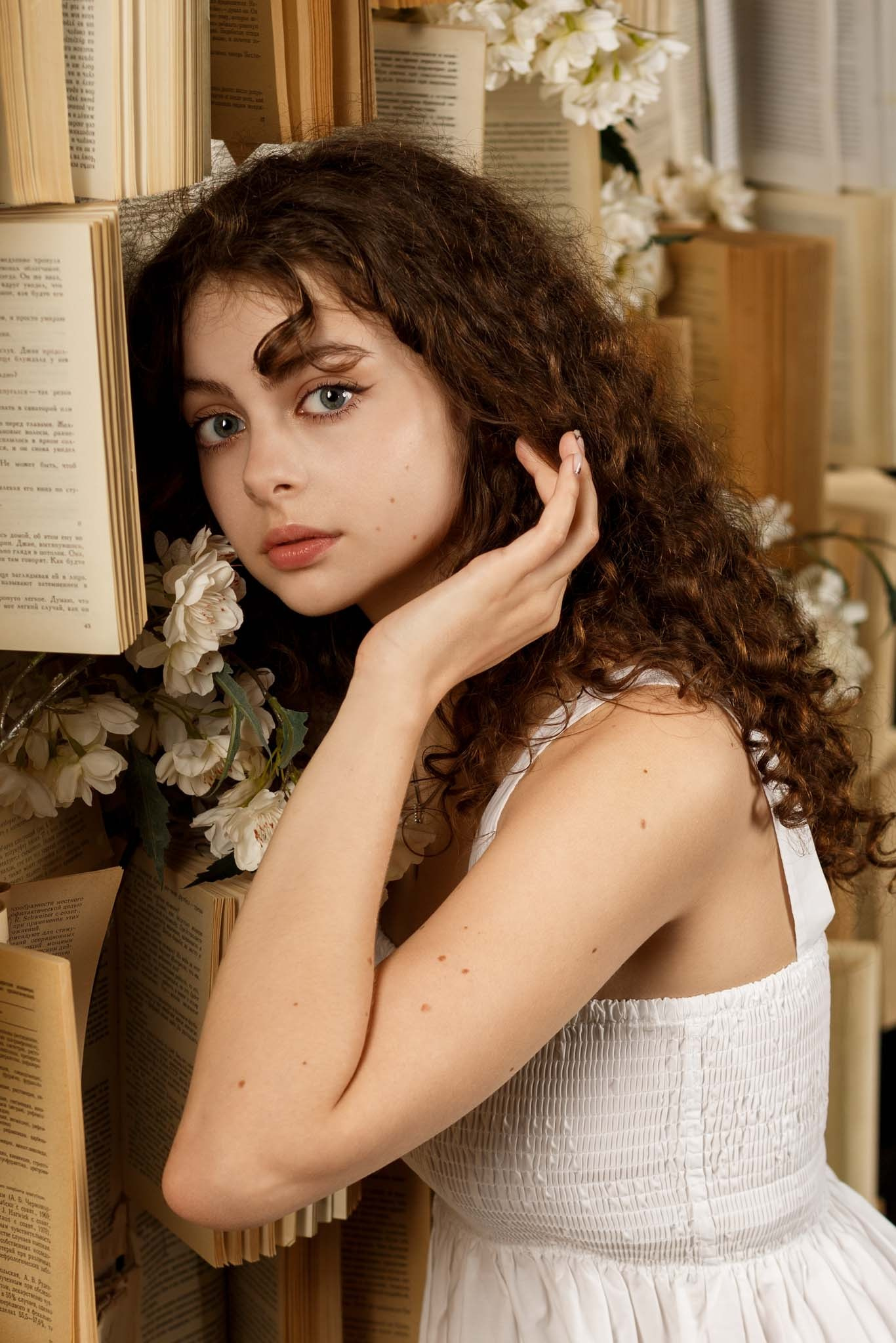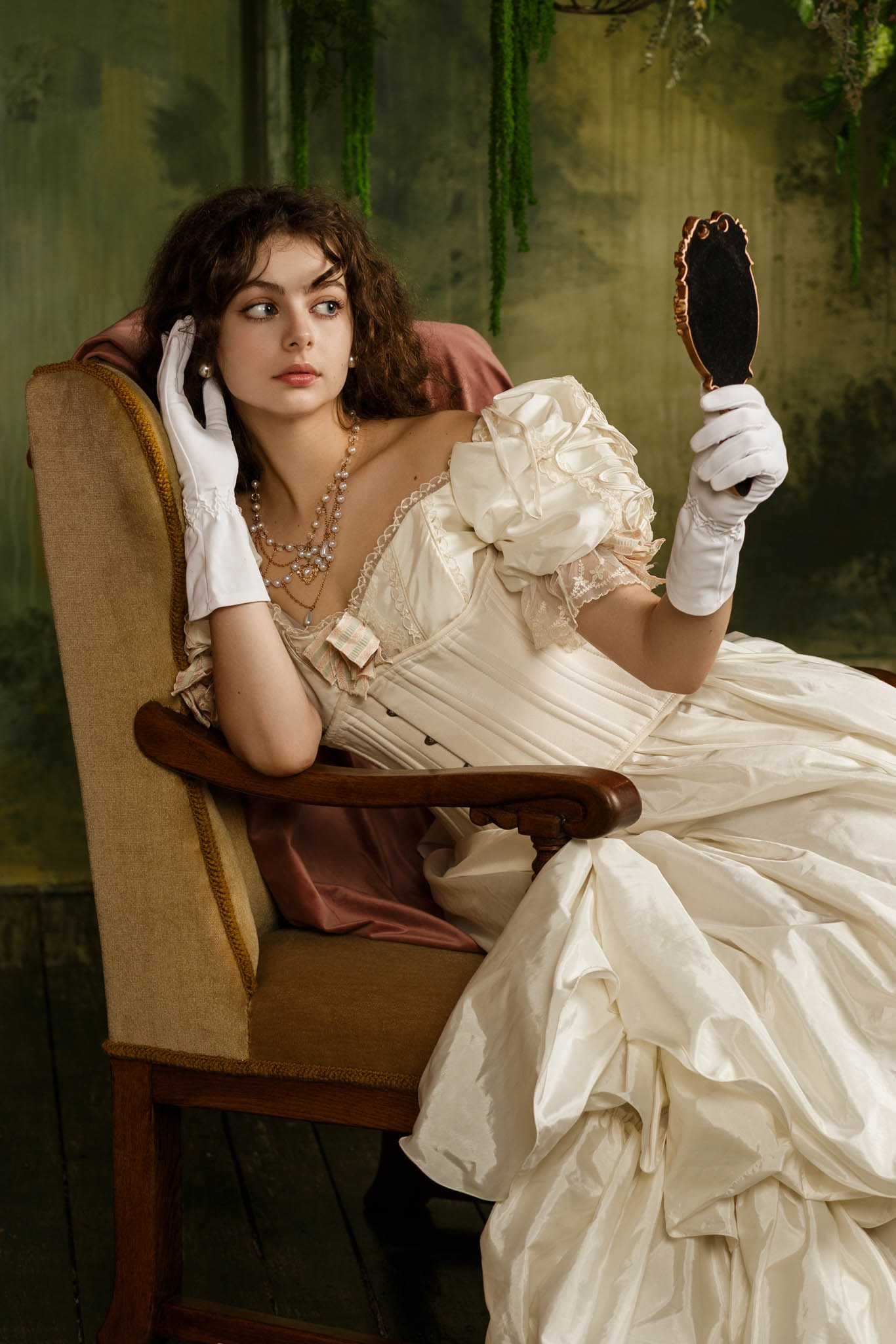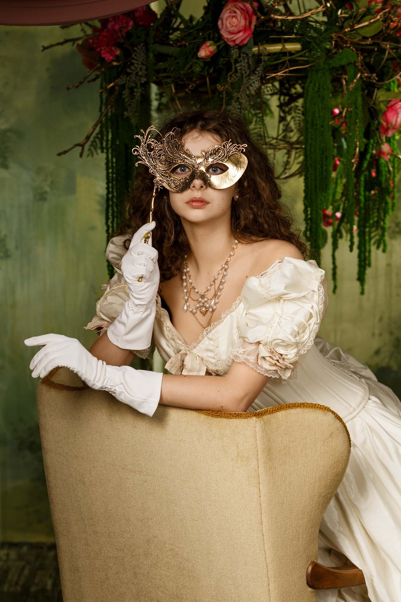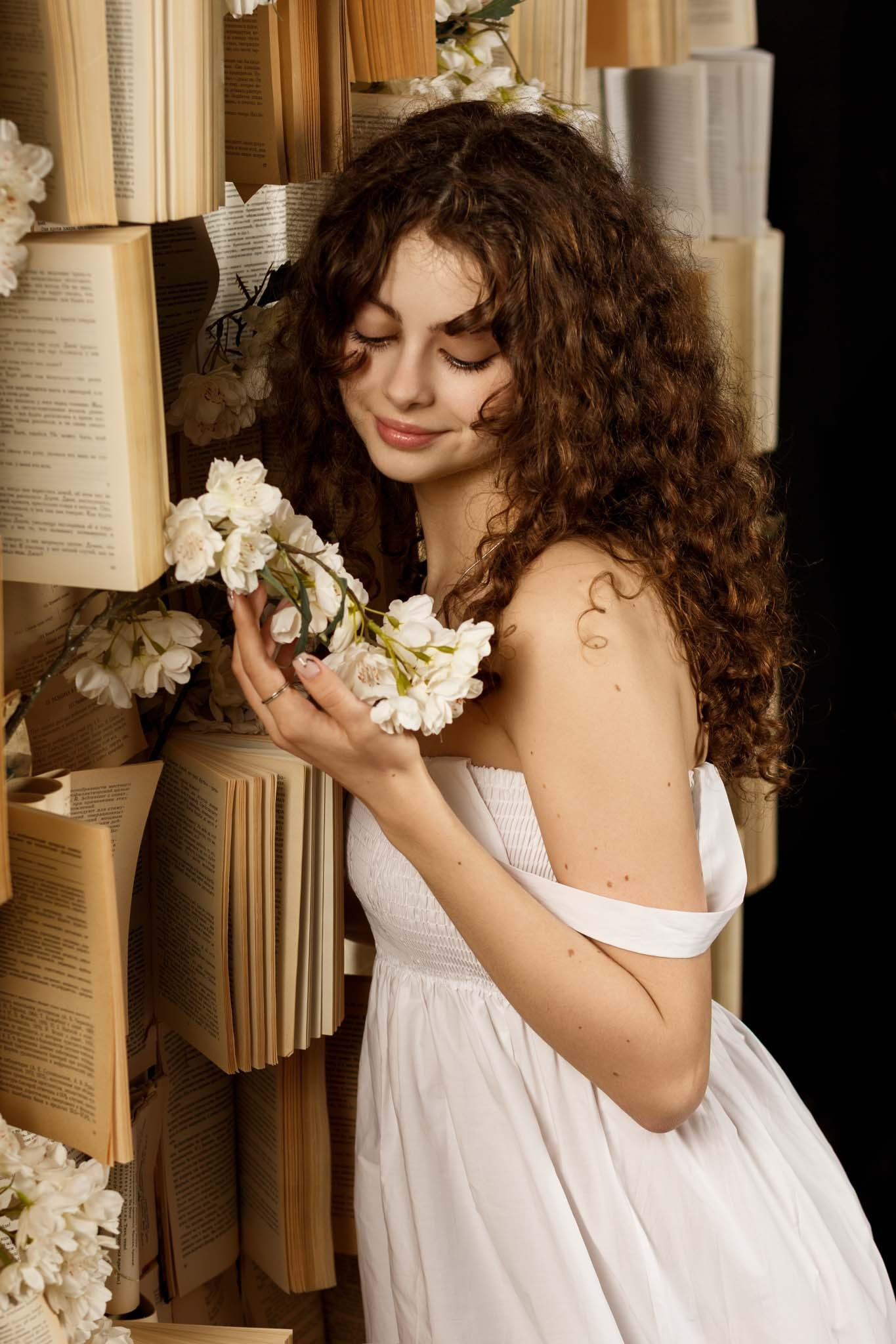 Ми вирішили створити твочу фотосесію про дівчину, яка любить читати класичні романи. За сюжетом, читаючи роман, вона поринає в свої мрії, тобто книжка слугувала порталом між реальністю та уявним світом. Для створення цього образу ми обрали фотостудію Ochi Project і сукню від Vintage Chic